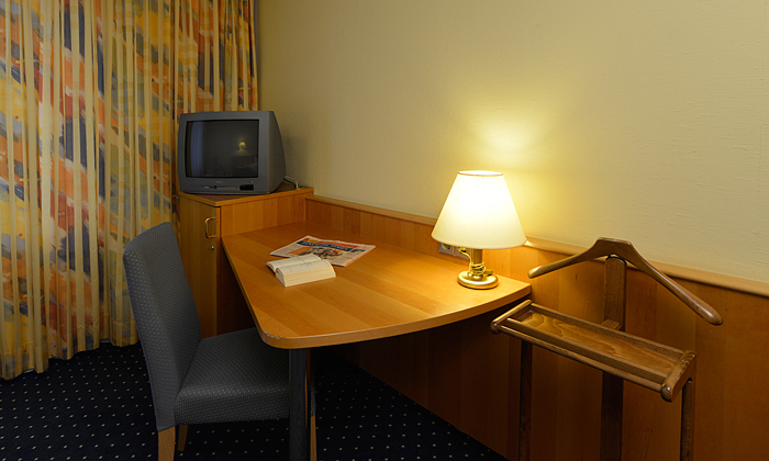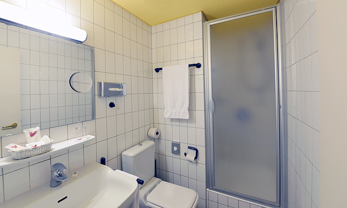 Das Badezimmer mit etwa 2,5 m² verfügt über eine Duschwanne mit Glasabtrennung, großem Spiegel am Waschtisch sowie beleuchteter Kosmetikspiegel und Föhn. In jedem Zimmer ist ein Farbfernsehgerät mit Kabelanschluss, Direktwahltelefon und W-LAN vorhanden. Alle Zimmer haben mindestens ein Fenster direkt nach draußen, das auch gekippt werden kann. Im Zimmerpreis enthalten ist auch unser reichhaltiges Frühstücksbuffet.